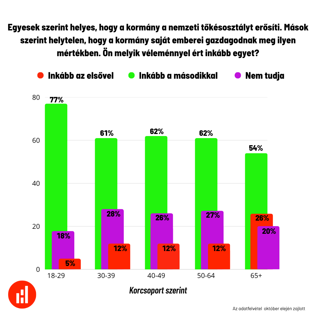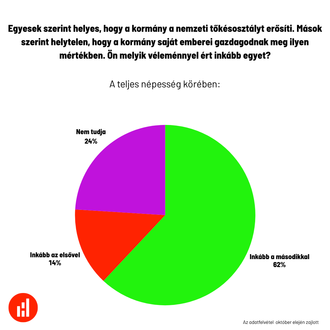 Az október eleji mérésben a kérdés megfogalmazása finomodott, és már két értelmezési keretet is adott: „Egyesek szerint helyes, hogy a kormány a nemzeti tőkésosztályt erősíti. Mások szerint helytelen, hogy a kormány saját emberei gazdagodnak meg ilyen mértékben.” Ezzel a kérdés már nem egyoldalú megítélést várt, hanem a két narratíva közötti választást. Az eredmény viszont szinte változatlan: 62 százalék inkább a második állítással, azaz a kritikus megközelítéssel értett egyet, és mindössze 14 százalék támogatta a kormányérvelést a „nemzeti tőkésosztály” építésének helyességéről. A bizonytalanok aránya 24 százalékra nőtt, ami arra utal, hogy ha a kérdés a kormány saját nyelvezetét is tartalmazza, akkor többen válnak óvatosabbá vagy kiváróvá – de ez nem jelenti, hogy a kritikusok aránya csökkenne, csupán a politikailag semlegesebbek nehezebben azonosulnak bármelyik retorikai kerettel.