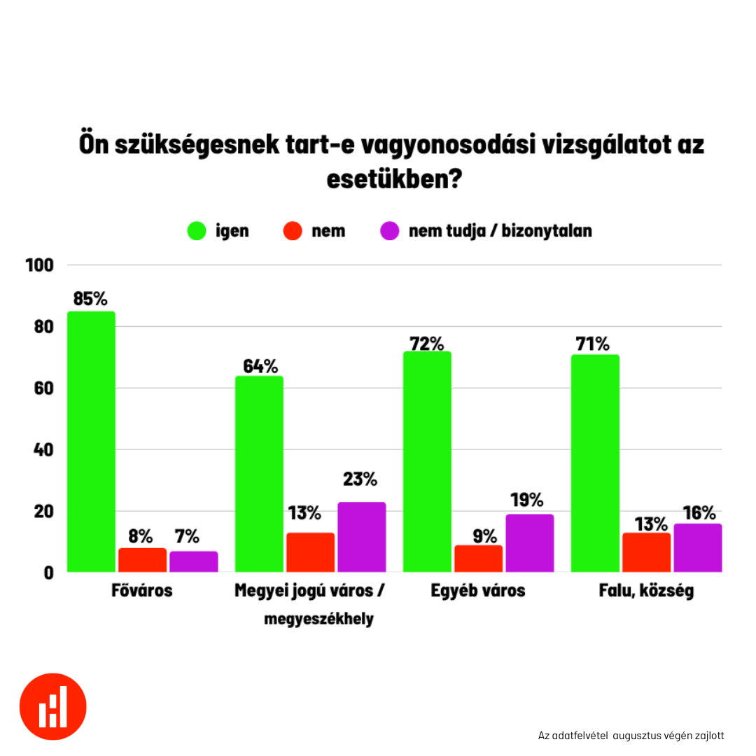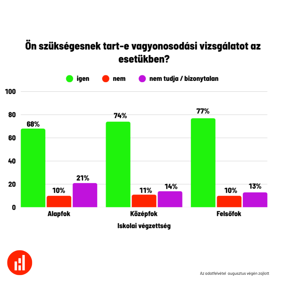 Az adatok részletes bontásából az is látszik, hogy a jelenség nem csak a politikailag aktív, ellenzéki vagy magasabban iskolázott csoportokat zavarja. A vagyonosodási vizsgálatot például a diplomások 77 százaléka, de az alapfokú végzettségűek 68 százaléka is támogatja. A fővárosban a támogatottság 85 százalék, de még a falvakban is 71 százalék. Ez azt jelzi, hogy a korrupcióval és igazságtalansággal kapcsolatos érzékenység nem kizárólag elit- vagy városi ügy, hanem széles körű társadalmi elvárás.
