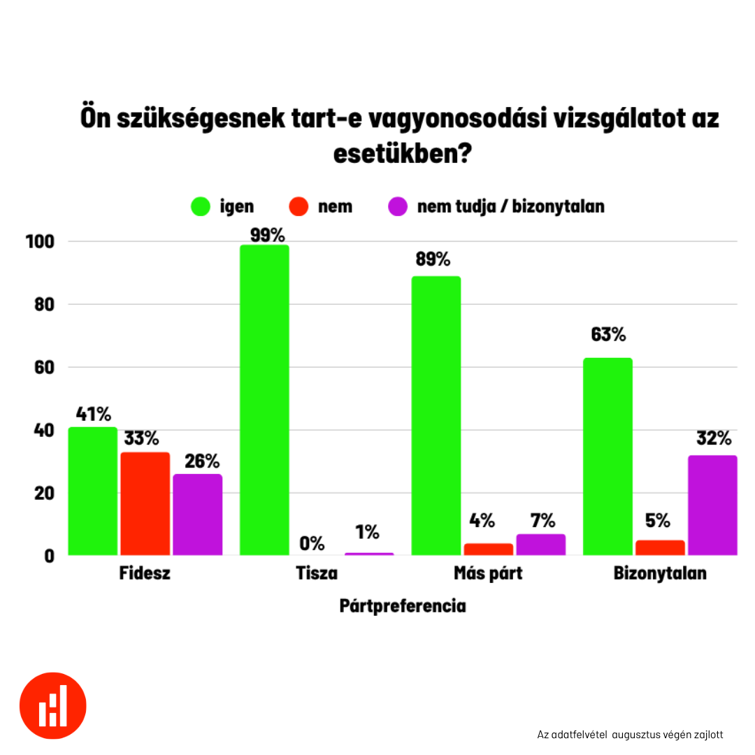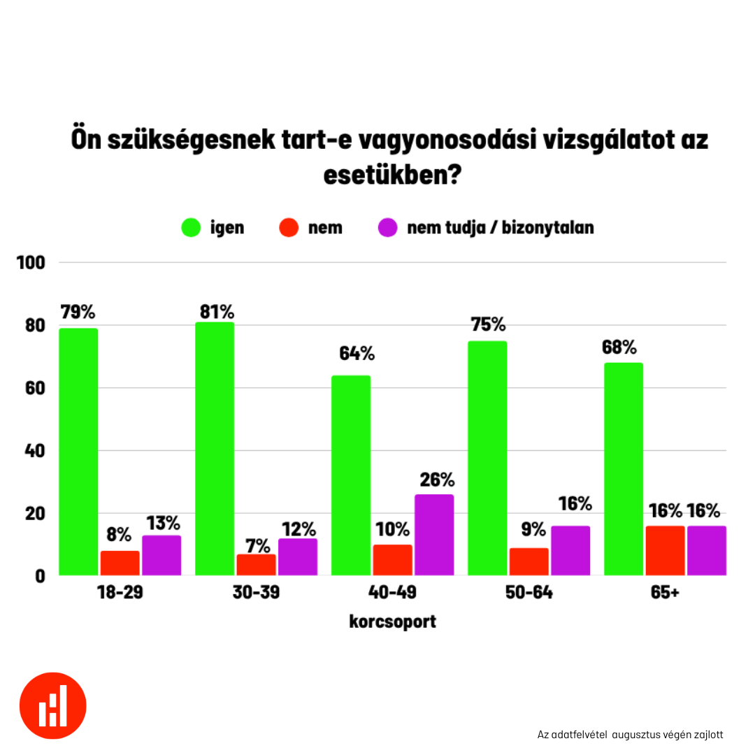 A második augusztusi kérdés már cselekvést is társított a véleményhez: „Ön szükségesnek tart-e vagyonosodási vizsgálatot az esetükben?” Itt a társadalmi konszenzus még erősebb lett: 72 százalék igennel válaszolt, mindössze 11 százalék mondott nemet, és 17 százalék nem tudott állást foglalni. Ez a különbség arra mutat rá, hogy a morális elutasításnál még szélesebb az aktív beavatkozás iránti igény – sokan azok közül is vizsgálatot sürgetnek, akik egyébként nem szívesen minősítenék a helyzetet „helyesnek” vagy „helytelennek”. Más szóval, a „vagyonosodási vizsgálat” kifejezés már nem pusztán erkölcsi ítéletet, hanem konkrét igazságtételi elvárást hív elő, ami a közéleti felelősségvállalás iránti vágyat is kifejezi.