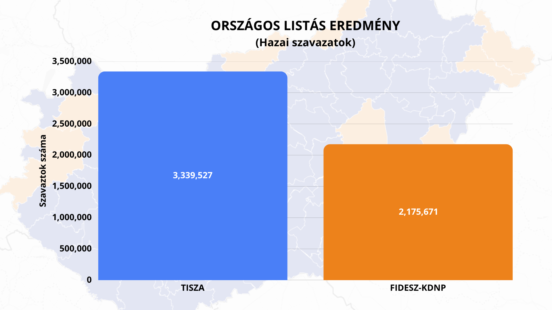 Ha kivesszük a képletből a fővárost és a megyei jogú városokat, a Tisza Párt akkor is közel félmillióval több szavazatot kapott, mint a Fidesz-KDNP listája. Ezen települések nélkül (megyei jogú városok, és Budapest) Magyar Péterék a középvárosokban, kisvárosokban és községekben összesen 1.914.665 szavazatot kaptak, Orbán Viktor pártja pedig 1.483.281-t.