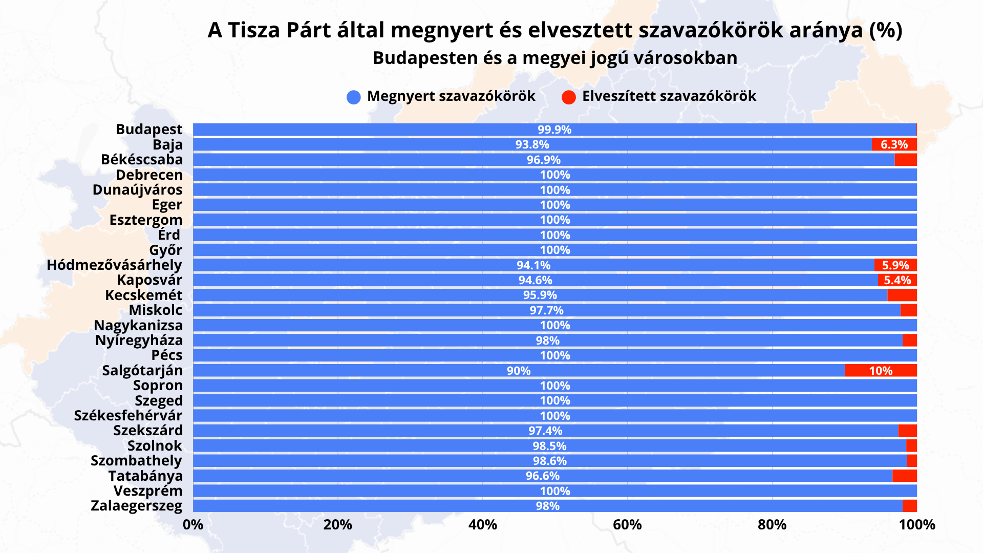 A megyei jogú városokban is tarolt a Tisza, Debrecenben, Dunaújvárosban, Egerben, Érden, Győrben, Nagykanizsán, Pécsen, Sopronban, Szegeden, Székesfehérváron, Veszprémben és Esztergomban az összes szavazókört megnyerték. De Békéscsabán (64/66), Hódmezővásárhelyen (48/51), Kaposváron (53/55), Kecskeméten (94/98), Miskolcon (127/130), Nyíregyházán (99/101), Salgótarjánban (33/37), Szekszárdon (38/39), Szombathely (72/73), Tatabányán (72/73), Zalaegerszegen (50/51) és Baján (30/32) is szinte mindenhol övék lett a szavazókörök több mint 90%-a.