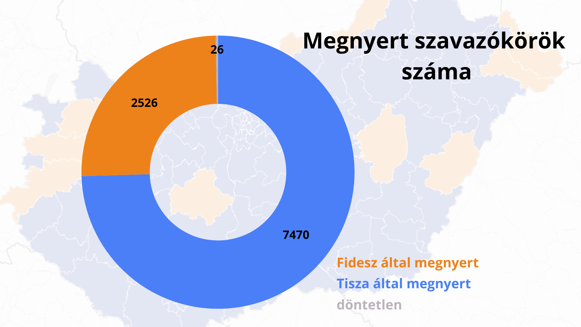 Április 12-én a Tisza Párt a hazai listás szavazatok 55,76%-t szerezte meg (3.339.527 szavazat), míg a Fidesz-KDNP listája csak 36,33%-t kapott (2.175.671 szavazat). A települési, valamint a szavazóköri szintet vizsgálva látható azonban igazán, hogy a Tisza “áradása” hogyan gyűrűzött be az ország szinte minden pontjára.