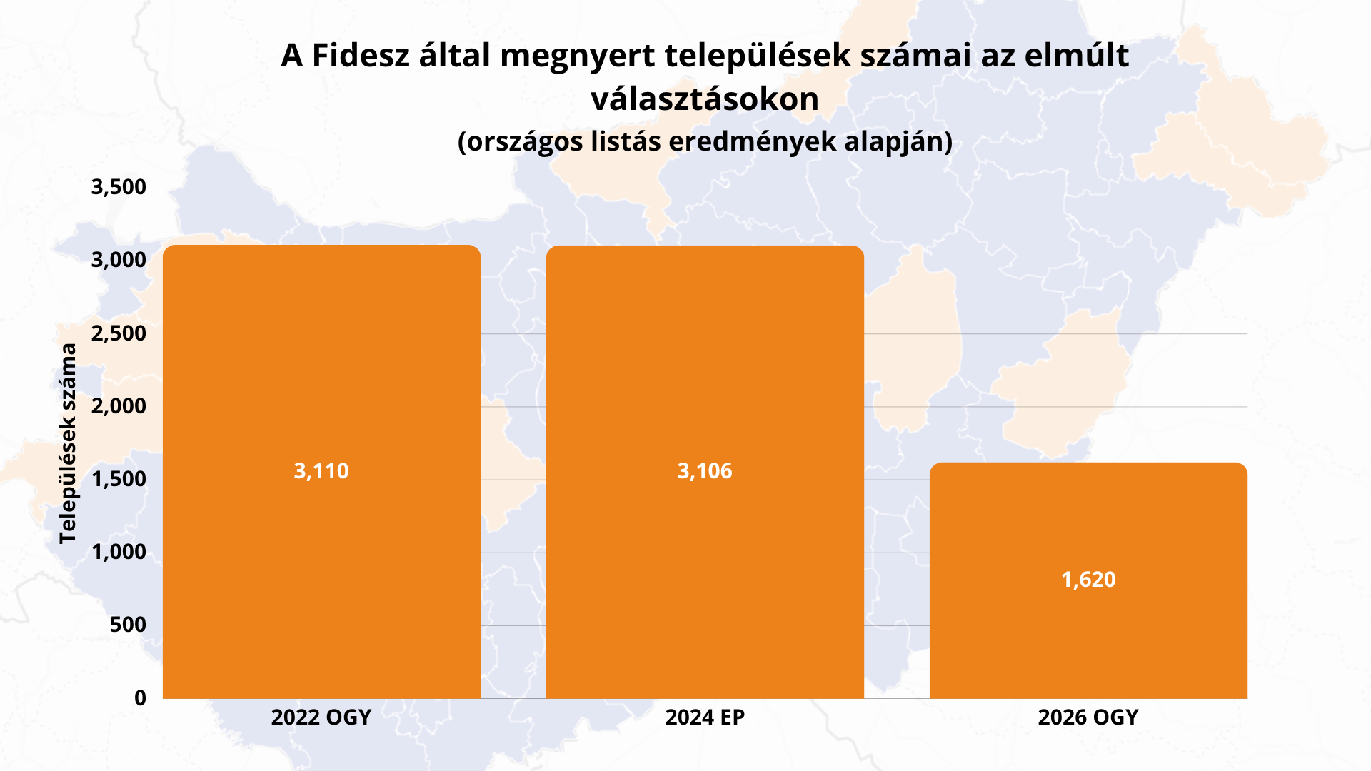 A teljes politikai átrendeződést szemlélteti még a települési szint. A 2026. április 12-i választásokon a Tisza Párt listája 1540 településen tudott nyerni, míg a Fidesz-KDNP 1620 településen bizonyult a legnépszerűbbnek. 17 településen született döntetlen. Bár számszerűleg a Fidesz listája több településen kapott nagyobb támogatást, összehasonlítva a 2022-es országgyűlési választásokkal, valamint a 2024-es európai parlamenti választásokkal, óriásit bukott ezen a fronton is.