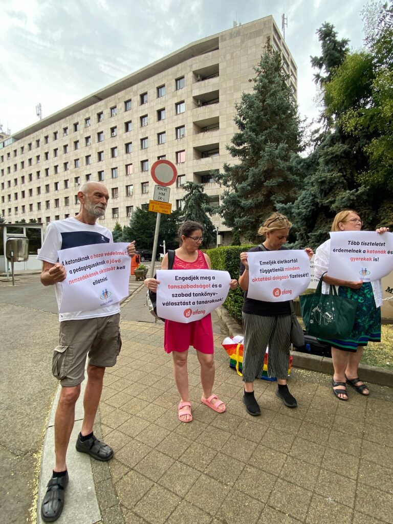 A Honvédelmi Minisztériumhoz érve aktivistáink különböző transzparensekkel hívták fel a figyelmet arra, hogy a katonák iskolába vezénylése helyett mivel lehetne javítani az oktatás helyzetén. A Szülői Hanggal közösen több mint 20 ezer tiltakozó aláírást vittünk el, majd egy sajtótájékoztatón elmondtuk, elfogadhatatlannak tartjuk ezt a jogszabályt, amelynek ráadásul a részletei a mai napig – kevesebb mint egy hónappal az iskolakezdést megelőzően – nem ismertek. A sajtótájékoztató ide kattintvanézhető vissza.