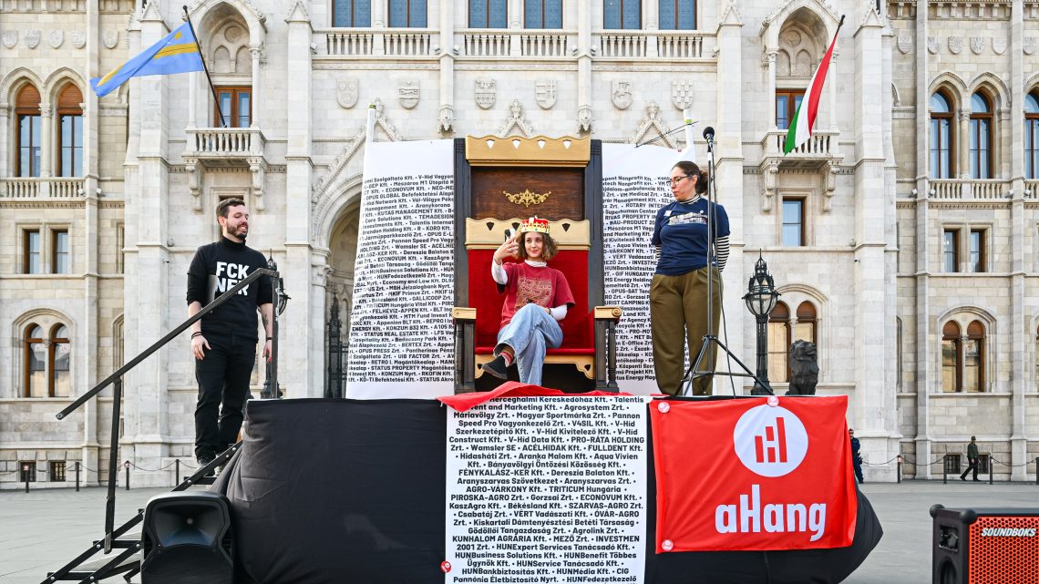 A tréfásnak tűnő, mégis nagyon is komoly mondanivalóval bíró esemény központi eleme az oligarcha trón volt, vörös bársonnyal borítva, előtte pedig azoknak a cégeknek a nevei sorakoztak, amelyek Mészáros Lőrinc érdekeltségébe tartoznak – bár a lista nem lehetett teljes, mert mire elkészült a molinó, már újabb vállalat került a portfóliójába. A trónra bárki leülhetett egy fotó erejéig, de a legtöbben inkább kellemetlennek, ijesztőnek, sőt fájdalmasnak érezték, hogy egy pillanatra is egy ilyen szerepbe kelljen helyezkedniük.