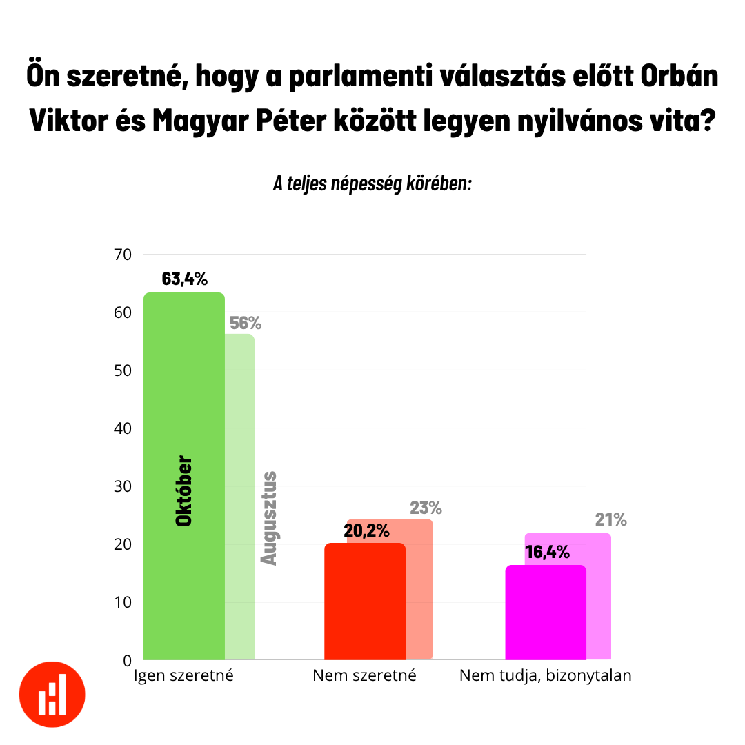 A legújabb közvélemény-kutatásunk szerint a magyar társadalom 63 százaléka szeretné, hogy Orbán Viktor és Magyar Péter között nyilvános vita legyen a parlamenti választás előtt. Ez jelentős növekedést jelent az augusztus végi 56 százalékhoz képest, vagyis két hónap alatt 7 százalékponttal nőtt a vita iránti társadalmi igény. Eközben a vitát elutasítók aránya 23-ról 20 százalékra csökkent, tehát a nyilvános párbeszéd iránti támogatás széles körben erősödött.