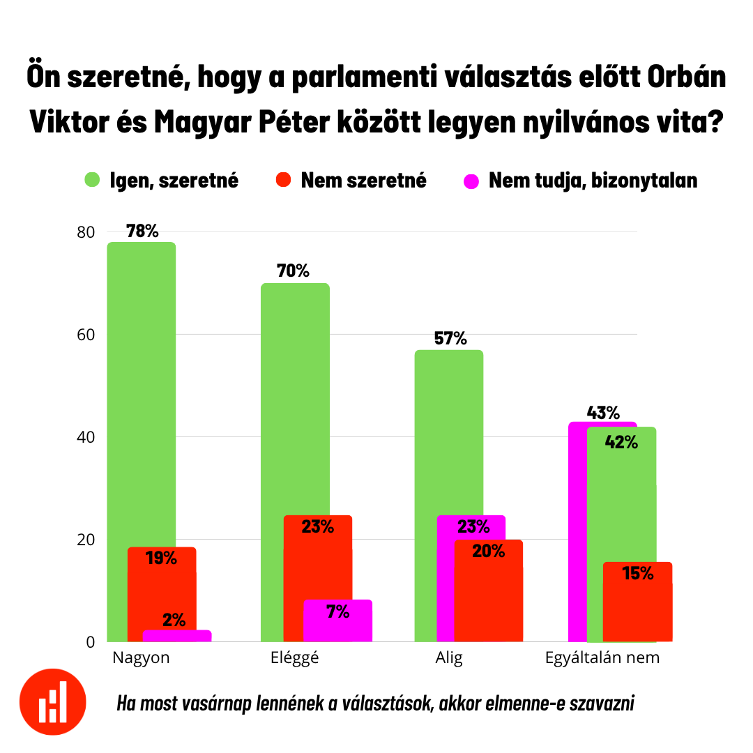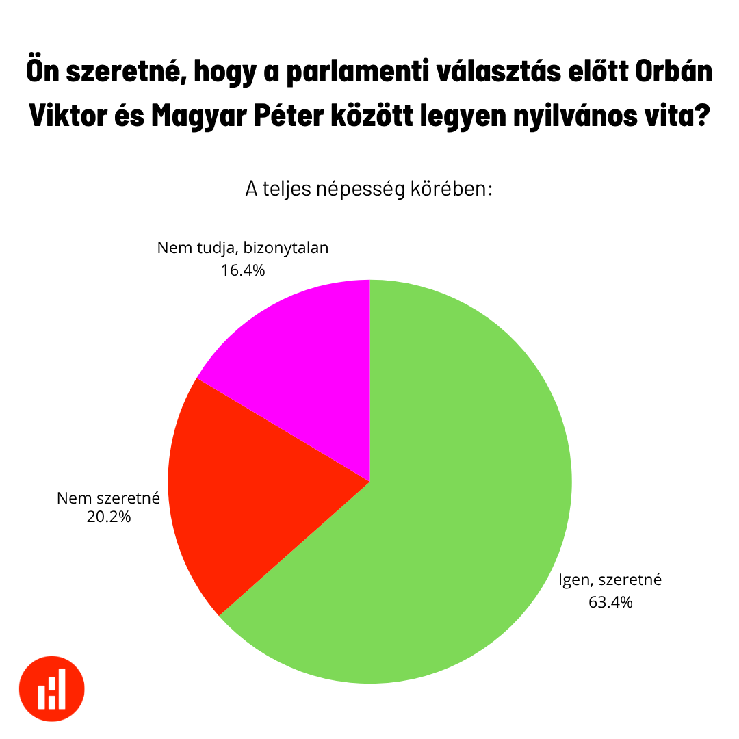 Tovább nőtt a miniszterelnök-jelölti vita iránti igény, már a társadalom több mint 63%-a szeretné, ha Orbán kiállna Magyar Péterrel szemben – derül ki a legújabb közvélemény-kutatásunkból*.