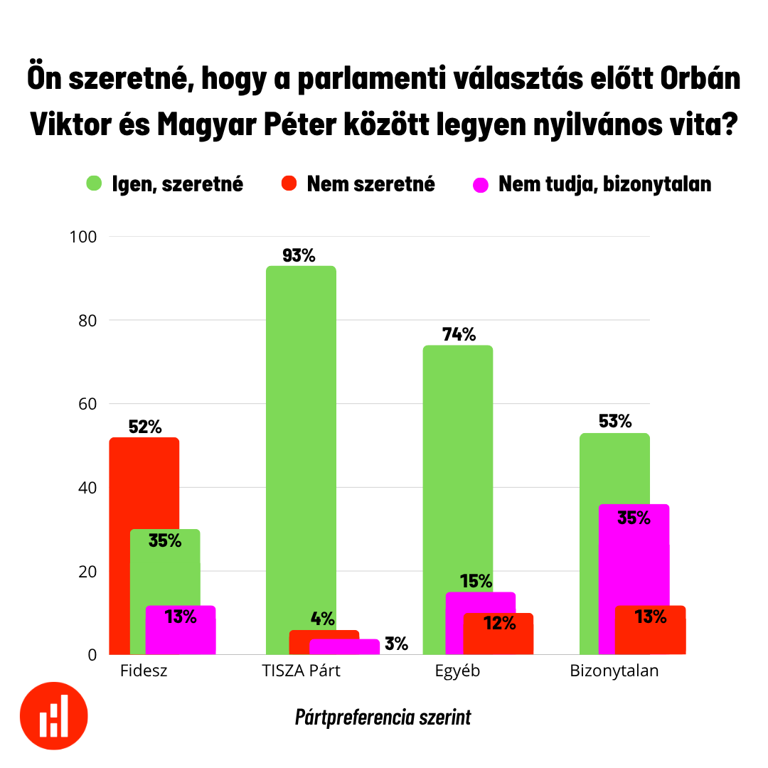 A pártpreferenciák mentén továbbra is mély törésvonal húzódik, de itt is kimutatható mozgás. A Fidesz-szavazók körében az augusztusi 33 százalékról 35 százalékra nőtt azok aránya, akik vitát szeretnének. A Tisza Párt szavazóinál a támogatás 86-ról 93 százalékra nőtt, tehát közel teljes az egyetértés a vita szükségességében. Az egyéb pártok szavazóinál 69-ről 74 százalékra emelkedett a támogatás, míg a bizonytalan szavazóknál 36-ról 53 százalékra, ami óriási, 17 százalékpontos növekedés. Ez utóbbi különösen figyelemre méltó, hiszen a bizonytalanok körében a vita igénye szinte duplájára nőtt – vagyis ez a téma hatékonyan képes megszólítani a politikailag inaktív vagy pártnélküli választókat.