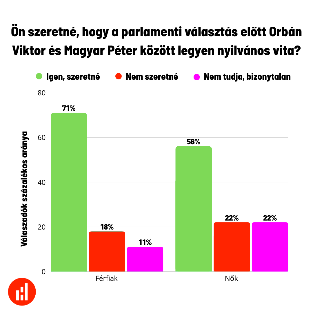 Nemek szerint a tendencia különösen érdekes. A férfiaknál a támogatás 65-ről 71 százalékra nőtt, miközben a bizonytalanok aránya csökkent. A nőknél még látványosabb az elmozdulás: az augusztusi 48 százalékról 56 százalékra nőtt azok aránya, akik vitát szeretnének, miközben a „nem tudom” válasz 26-ról 22 százalékra csökkent. Ez arra utal, hogy a vita ügye a nyár vége óta különösen a női választók körében vált tudatosabbá és elfogadottabbá.