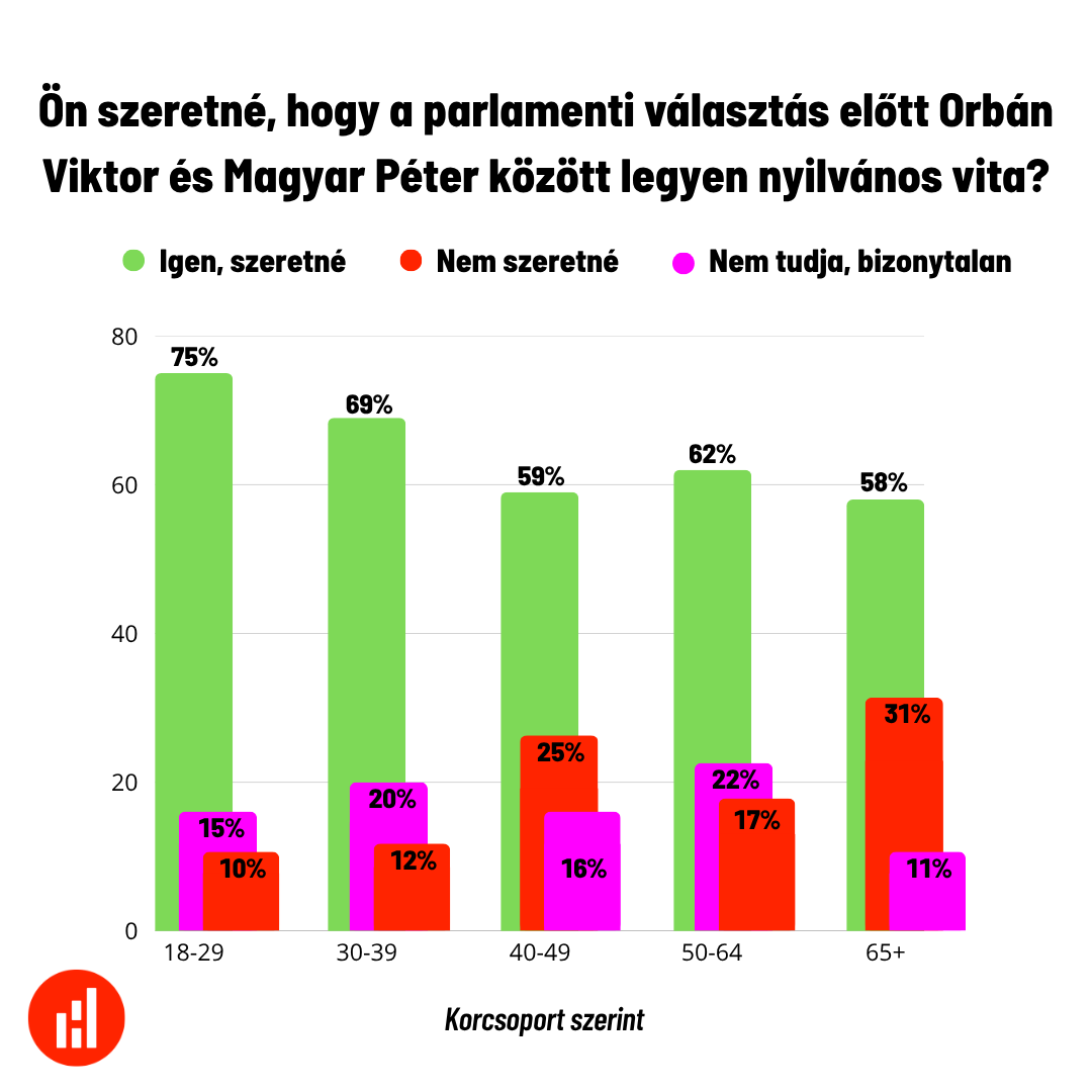 A korcsoportos bontás szinte minden generációnál növekedést mutat, különösen a középkorúaknál. A fiatalok (18–29 évesek) továbbra is a legnyitottabbak: 75 százalékuk támogatja a vitát, ami enyhe növekedés a korábbi 71 százalékról. A 30–39 éveseknél 72-ről 69 százalékra mérsékelt csökkenés látható, de még így is kiugróan magas. A 40–49 éves korosztályban viszont erőteljesen nőtt a vitaigény: 42-ről 59 százalékra, tehát 17 százalékponttal több választó szeretné, hogy a két politikus kiálljon egymással. Az 50–64 évesek körében is nőtt a támogatás (55 → 62 százalék), miközben a 65 év felettieknél is elmozdulás történt (48 → 58 százalék). Összességében elmondható, hogy a vita iránti igény minden korosztályban erősödött, leginkább a középkorúaknál.