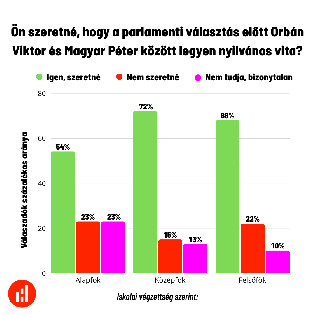 Az iskolai végzettség szerinti adatok is a növekedés irányába mutatnak. Az alapfokú végzettségűek körében a vita támogatottsága 49-ről 54 százalékra nőtt, a középfokúaknál 59-ről 72 százalékra, ami látványos, 13 százalékpontos növekedés. A felsőfokú végzettségűek körében viszont kisebb változás történt: 64-ről 68 százalékra emelkedett a támogatás. Mindez arra utal, hogy a politikai vita gondolata leginkább a középfokú végzettségű, aktív korú választók között erősödött fel, akik jellemzően a politikai küzdelmek legfontosabb célcsoportját jelentik.