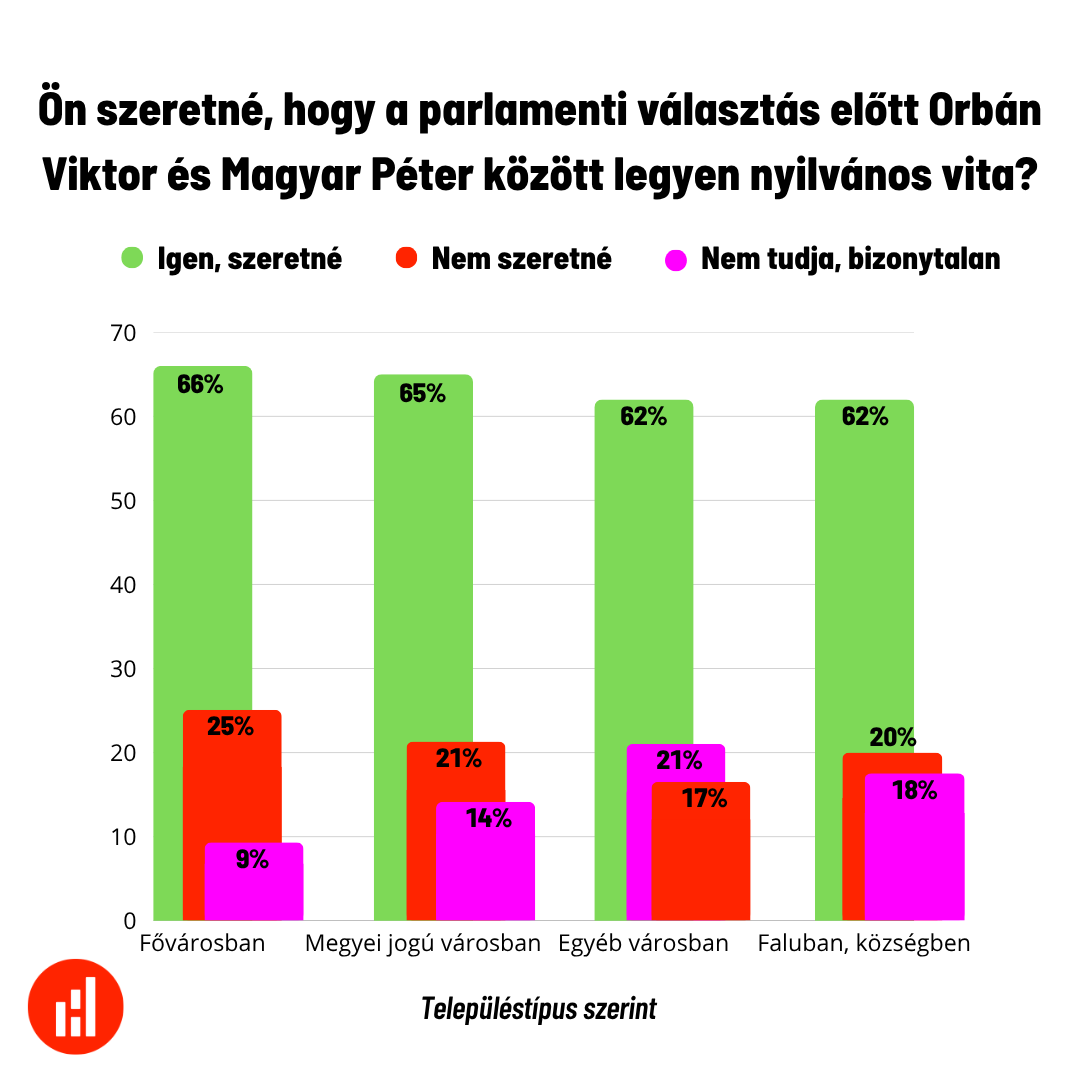 A településtípus szerint a fővárosban 73-ról 66 százalékra csökkent a támogatás, de továbbra is magas maradt, miközben a megyei jogú városokban (56 → 65 százalék) és az egyéb városokban (47 → 62 százalék) egyaránt növekedett a vitaigény. A falvakban gyakorlatilag stabil maradt (56 → 62 százalék). Ez alapján elmondható, hogy a vita iránti elvárás Budapestről kiszélesedett a vidéki Magyarországra, különösen a városias térségekben.