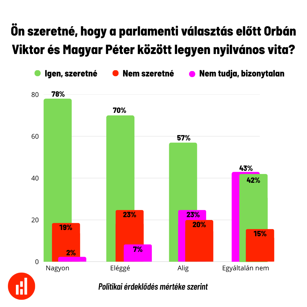 A politikai érdeklődés szintje továbbra is erősen összefügg a vita iránti igénnyel, de itt is javulás látható minden kategóriában. Azok között, akik nagyon érdeklődnek a politika iránt, a támogatás 70-ről 78 százalékra emelkedett. Az „eléggé érdeklődők” körében 68-ról 70 százalékra, míg az „alig érdeklődők” csoportjában 48-ról 57 százalékra nőtt a vitaigény. A politikától teljesen elfordultak körében azonban nagymértékű növekedés látható (27 → 42 százalék), ami arra utal, hogy a vita témája az apolitikus választókat is megmozdította.