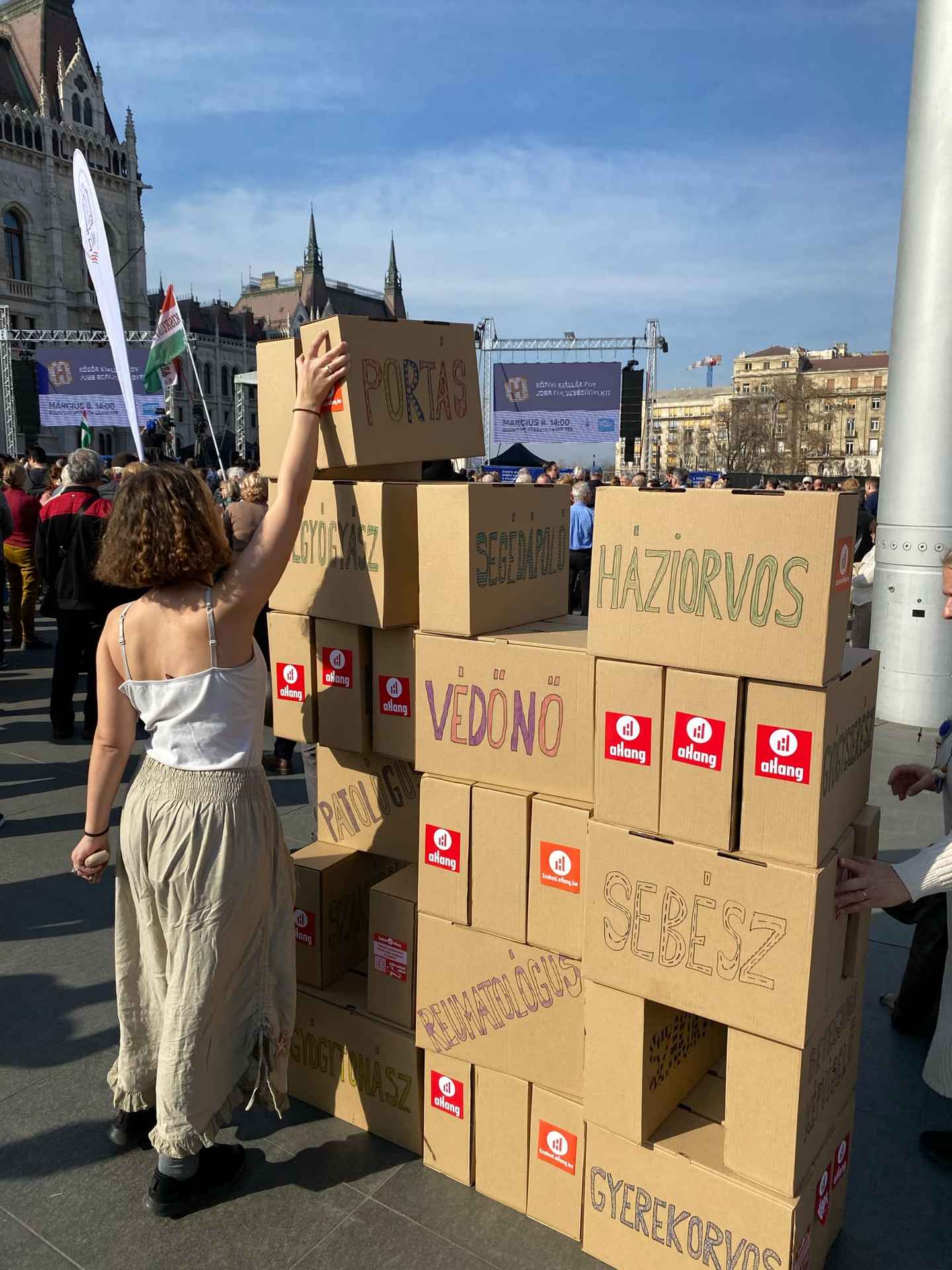 At the demonstration, aHang’s Budapest activist group—the Budapest aPont—built a giant Jenga tower. Each block was labeled with a healthcare profession, such as physiotherapist, surgeon, dietitian, or paramedic. The collapsing tower symbolized how the healthcare system is falling apart without its workers.