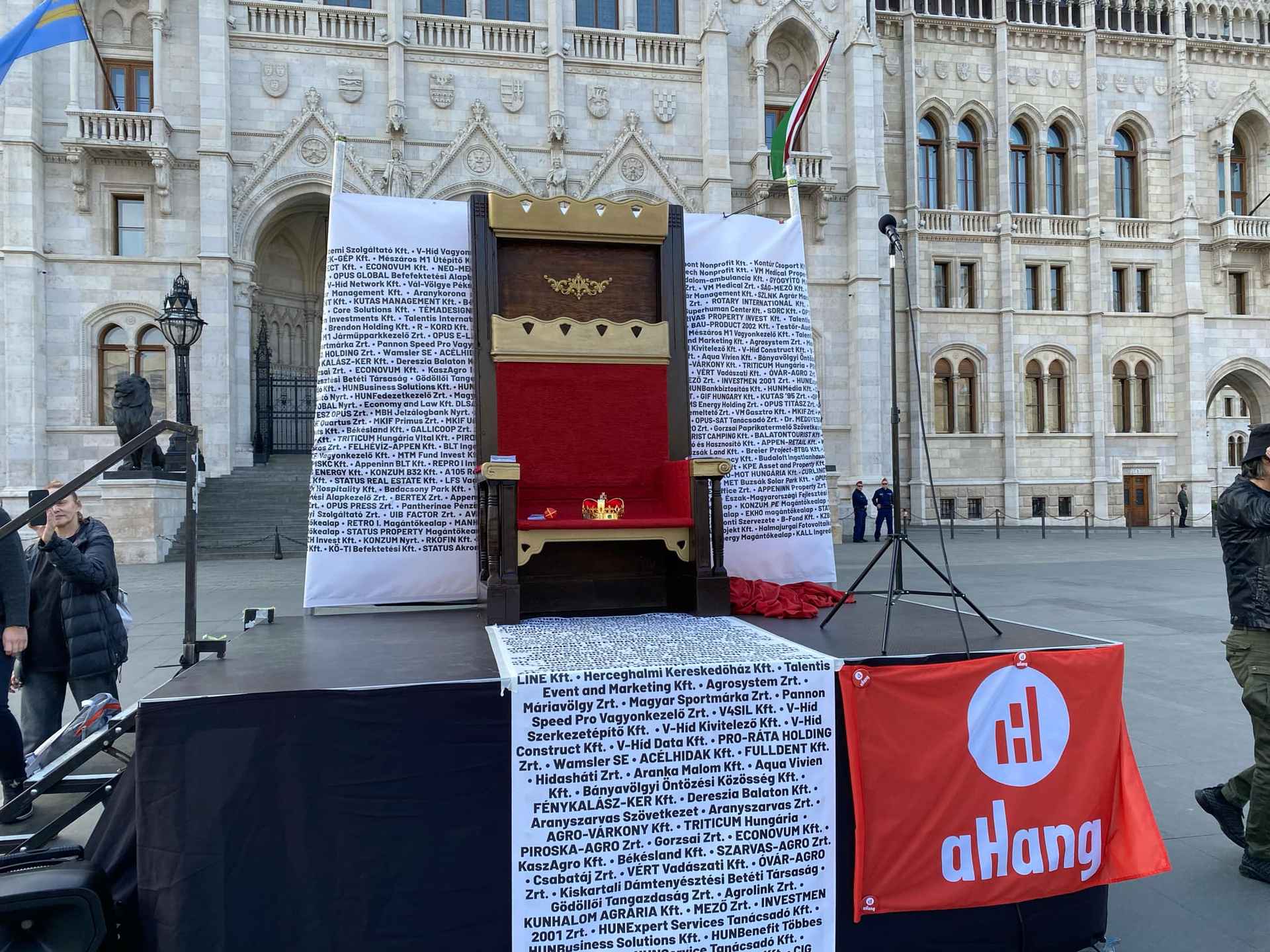 We also laid out a “red carpet” leading to the throne on Kossuth Square, printed with the names of companies linked to Lőrinc Mészáros. The banner stretched five meters and bore hundreds of company names. The most surreal part of the action was that by the time it arrived from the printer, news broke that yet another company — an airport — had been purchased by the Prime Minister’s childhood friend.